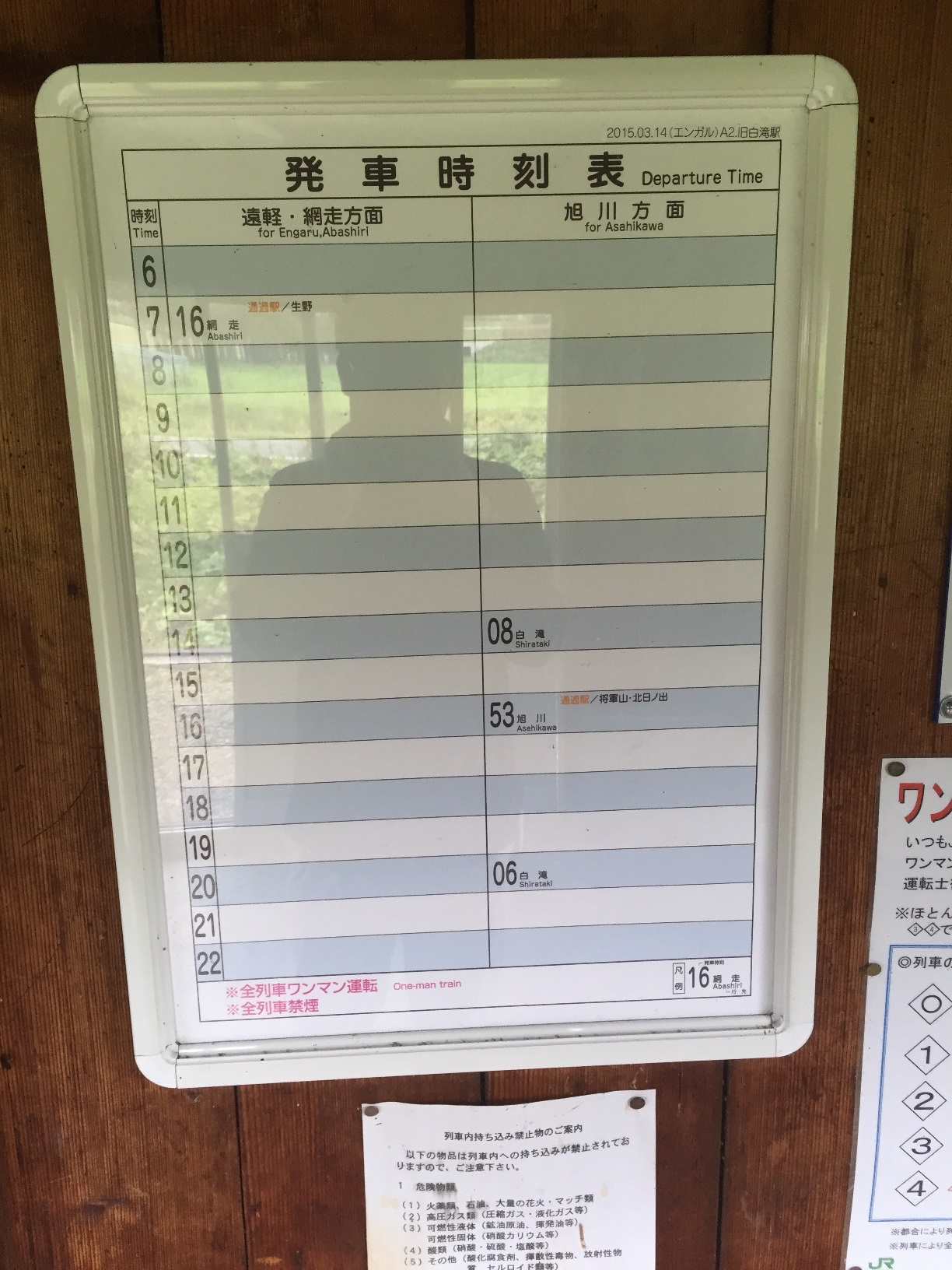 僅か四本。上下合計です。使いたくても使えない駅ですね。たぶん地元人よりも私の様な物好きの利用者のほうがはるかに多いです。車無いと絶対に生活できませんね! ・・・写真に気持ち悪い人影が写っていても気にしないように。 諸事情により、長居できなくなったので早々に退散。幸い無事に国道に戻ることが出来ました。さらに車で遠軽方面に。